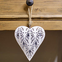A shabby chic inspired hanging metal heart with a rope hanger and overly distressed white washed finish