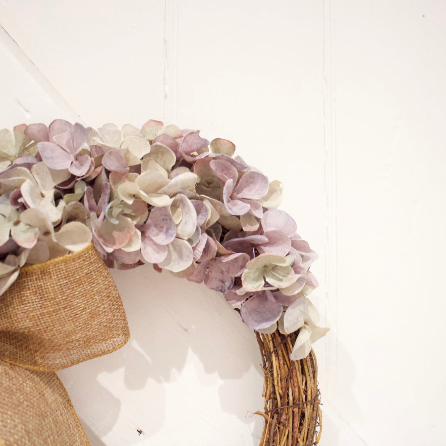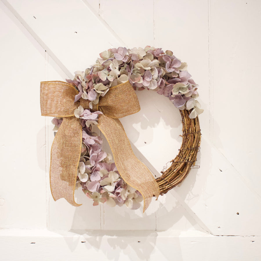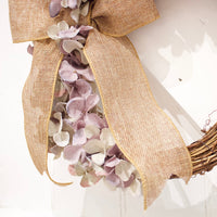 Beautifully timeless, this handmade artificial hydrangea wreath brings the delicate beauty of garden florals to your home. Set on a natural woven grapevine base, the wreath features an elegant asymmetrical arrangement of lifelike hydrangea blooms in muted vintage tones of dusty rose, antique mauve and soft sage. The carefully blended colour palette creates a gently aged look and the exposed vine frame along with a hand-tied burlap bow and flowing ribbon tails completes the rustic feel.