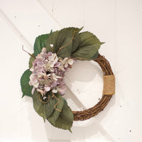 Set upon a natural grapevine base, the design features a full, softly layered hydrangea bloom in muted blush, dusty mauve and sage tones that are framed by richly textured hydrangea leaves with delicate veining detail and an under layer of eucalyptus leaves.
